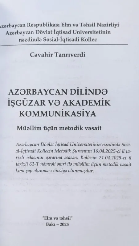 UNEC nəzdində Sosial İqtisadi Kollecin Azərbaycan dili və ədəbiyyatı müəllimi Cəvahir Tanrıverdinin "Azərbaycan dilində işgüzar və akademik kommunikasiya" adlı müəllim üçün metodik vəsaiti işıq üzü görüb. Metodiki vəsaitdə “Azərbaycan dilində işgüzar və akademik kommunikasiya” fənninin tədrisində əsas hədəf kimi tələbələrin nəzəri biliklərlə yanaşı, praktik bilik və bacarıqları ön plana çəkilir. Azərbaycan dilində təqdimat hazırlamaq, natiqlik, akademik və işgüzar yazı bacarıqlarının aşılanmasına xüsusi diqqət yetirilir. “Azərbaycan dilində işgüzar və akademik kommunikasiya” fənninə dair müəllimlər üçün metodik vəsaitdə yuxarıda qeyd edilmiş məlumatlar və dərs proqramında əks olunmuş mövzular metodik qaydalara uyğun olaraq izah edilib aydınlaşdırılır. Metodik vəsait üç fəsildən ibarətdir. Hər bir fəsil öz növbəsində müəyyən hissələr – mövzularla əhatələnir. Birinci fəsil “Azərbaycan dilində işgüzar və akademik kommunikasiya fənninin tədrisində interaktiv təlim metodundan istifadə mühüm məsələ kimi” adlanır.Bu fəsildə interaktiv təlim metodunun mərhələ və üsulları ilə bağlı məlumatlar oxucunun diqqətinə çatdırılır. Müasir təlim üsulları əsasında layihələrin hazırlanması, qiymətləndirmə,fəndaxili və fənlərarası əlaqələr ətraflı surətdə izah edilir. İnteraktiv təlim metodunun hər bir mərhələsi haqqında ayrı-ayrılıqda məlumat verilir. Tədris üsulları haqqında verilən məlumatlara əsasən müəllim dərsin mövzusundan asılı olaraq onlardan istifadə zamanı müəyyən seçim edib fərqli üsullar tətbiq edə bilər. Müəllimlər üçün metodik vəsaitin ikinci fəsli “Azərbaycan dilində işgüzar və akademik kommunikasiya” fənnində proqramın sistemləşdirilməsi işinin təşkili məsələləri” adlanır. Bu fəsildə müəllimin fənn üzrə verilmiş mövzuların tədrisi zamanı diqqət yetirməli vacib məqamlar nəzərə çatdırılır. Həmçinin bu fənnin əsas məqsəd və vəzifələri haqqında məlumatlar qeyd edilir, müasir dövrdə ünsiyyət prosesinin təşkili, işgüzar danışıq və söhbətlər, yazılı işgüzar kommunikasiyanın qaydaları araşdırılır. Təhsilalanların bu fənni öyrənən zaman elmi təqdimatın quruluş və tərtib qaydalarına, elmi məruzəni hazırlamaq bacarıqlarına, müzakirə sənətinə, işgüzar kommunikasiyanın nəzəri əsaslarına, akademik yazı vərdişlərinə yiyələnmələri üçün üsul və vasitələr müəyyən edilir. Üçüncü fəsil “Azərbaycan dilində işgüzar və akademik kommunikasiya fənninin interaktiv təlim metodu ilə tədrisi” adlanır. Bu fəsildə proqram üzrə verilmiş 30 mövzunun hər biri ilə bağlı dərsin təşkili haqqında məlumatlar əks olunur. Burada yazılı işgüzar kommunikasiyaya dair mövzuların tədrisi zamanı yazı işinin tətbiqi, təqdimatların hazırlanması, yazılı sənədlərin tərtib qaydalarının düzgün mənimsənilməsi kimi xüsusi diqqət yetirilməli vacib məqamlar ardıcıllıqla təqdim edilir. Hər bir mövzunun tədrisi interaktiv təlim metodunun tərkib hissəsi olan beş mərhələyə əsasən təşkil olunur. Bu zaman müəllim tərəfindən etik və psixoloji davranış qaydalarına nəzarət edilməsi ilə bağlı ətraflı şərh verilir. İnteraktiv təlim metodunun qiymətləndirmə mərhələsinin icrası zamanı müxtəlif nüanslar da diqqətdə saxlanılır. Bu mərhələnin həm tələbələr, həm də müəllim tərəfindən yerinə yetirilməsi ilə bağlı müəyyən göstərişlər metodik vəsaitdə qeyd edilmişdir. Kitabın elmi redaktoru Azərbaycan Dövlət İqtisad Universitetinin “Azərbaycan dili” kafedrasının müdiri, filologiya elmləri doktoru, professor Tofiq Əbdülhəsənli, rəyçiləri isə Azərbaycan Respublikasının Təhsil İnstitutu,AMEA Nəsimi adına Dilçilik İnstitunun aparıcı elmi işçisi, filologiya üzrə fəlsəfə doktoru, dosent Təranə Şükürlü, Mingəçevir Dövlət Universitetinin “Humanitar fənlər” kafedrasının baş müəllimi, filologiya üzrə fəlsəfə doktoru Pərvin Ağabaladır. Xatırladaq ki, bu, 2020-2021-ci illərdən ali və orta ixtisas təhsil müəssisələrində tədris olunmağa başlayan "Azərbaycan dilində işgüzar və akademik kommunikasiya" fənninə dair UNEC nəzdində Sosial İqtisadi Kollecin müəllimi Cəvahir Tarverdi tərəfindən yazılmış ilk metodik vəsaitdir.